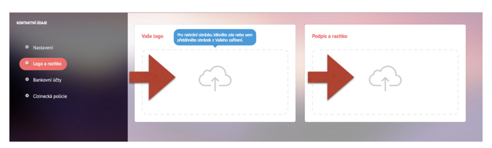 7. Když se nyní podíváte doleva, uvidíte tam další možnosti nastavení v rámci tzv. podmenu. Červeně je vždy označen úsek, který aktuálně vidíte. Aktuálně jste si tedy v rámci Kontaktních údajů nastavili podmenu “Nastavení”. Prosím, všímejte si těchto podmenu, které můžete vidět v rámci nastavení téměř u všech položek. My půjdeme v rámci tohoto nastavení dále a podíváme se na Logo a razítko.